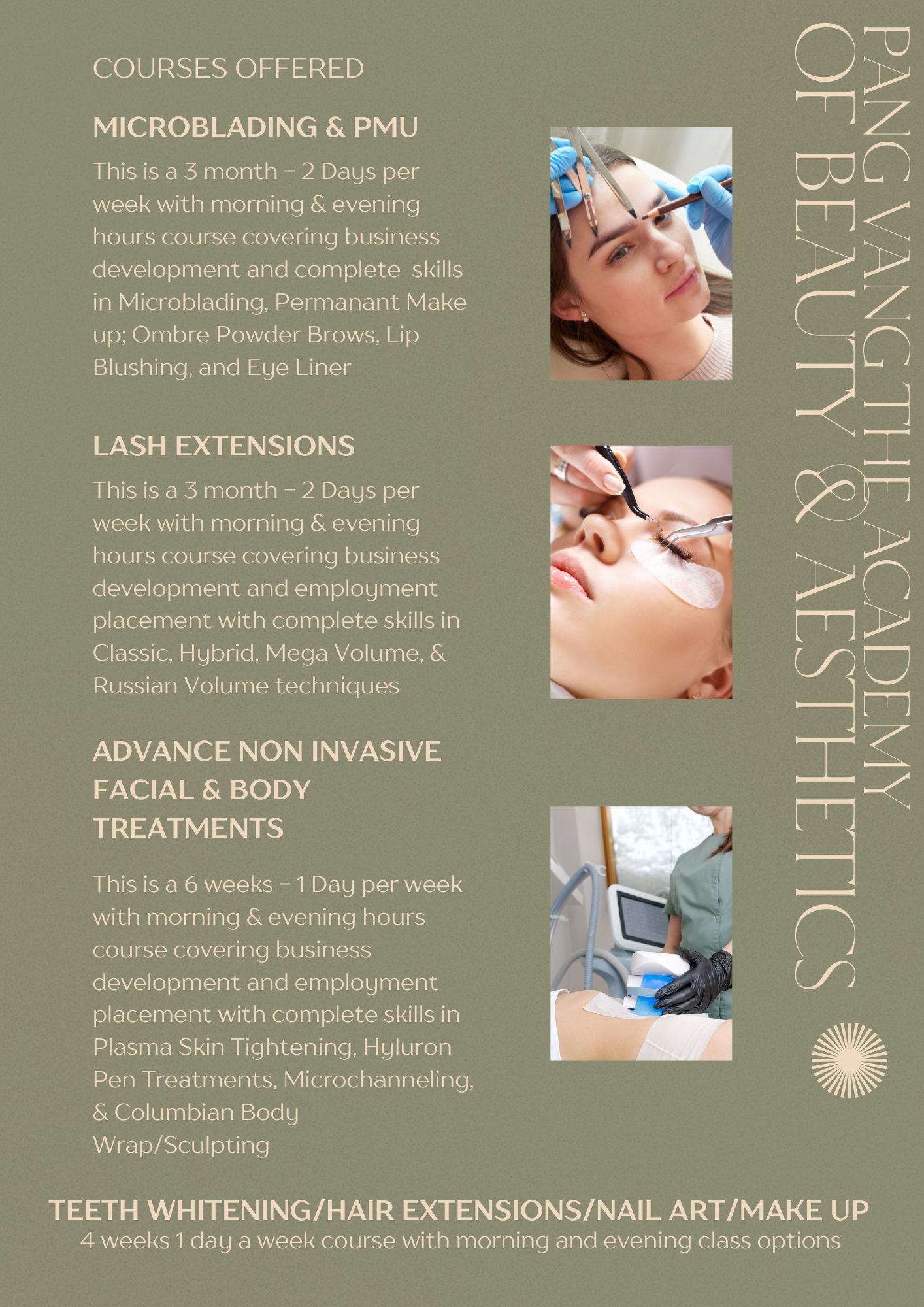 I have compiled all of the education I have been providing from Hair Extensions, Make Up, Nails, Lash Extensions, Permanent Makeup, Body Sculpting, Advance Non Invasive Skin treatments, Cosmetic Teeth Whitening, to Building/Rebranding Establishing Business and Essential skills into an entire 3 months, 2 days a week, 2-4 hours per morning & evening class time options curriculum.